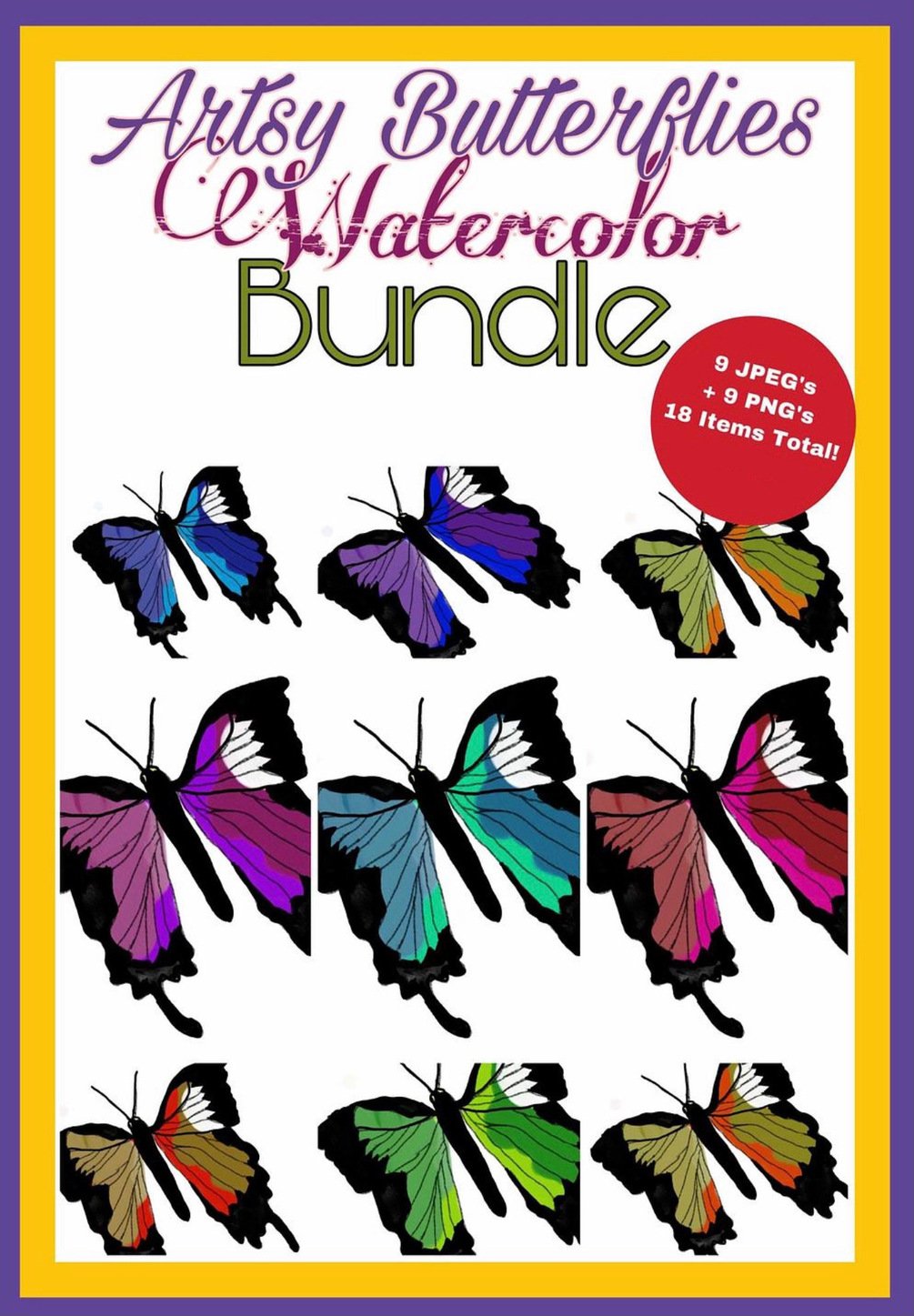 AnnorStock_Artsy Hand Drawn Watercolor Butterflies Bundle! - Commercial Use! Royalty-Free! Instant Digital Download - 18 Assets Total! $5 You'll Receive 9 JPEGS Butterflies 9 PNGS Butterflies 18 Items Total! - Instant Digital Download!